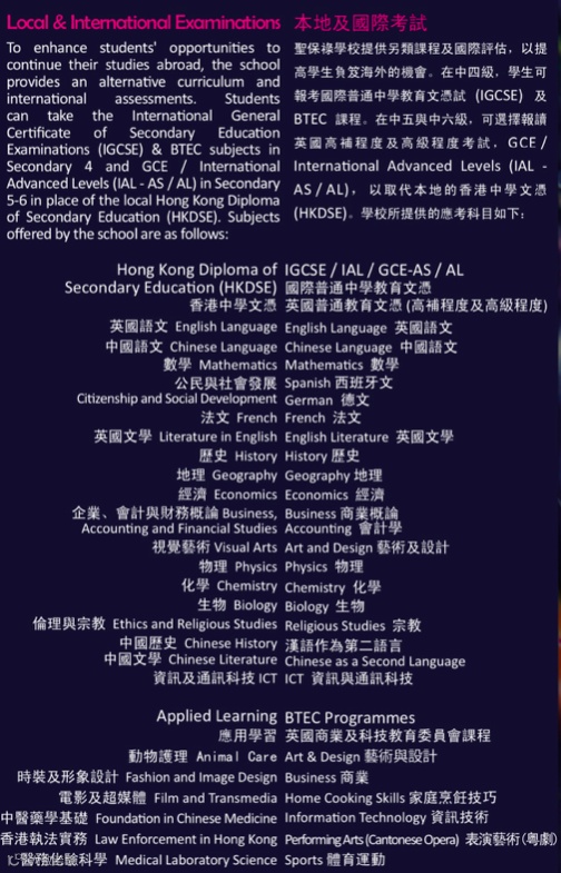 圣保禄学校提供国际课程及评估。初一初二根据香港正常课程教学,主语为英文,只会在中文、中文历史、普通话科目中使用中文;中四学生可报考国际普通中学教育文凭试 (IGCSE) 及BTEC课程;中五与中六学生可选择报读本地课程DSE或者英国高补程度及高级程度考试GCE/International Advanced Levels(IAL-AS/AL)。