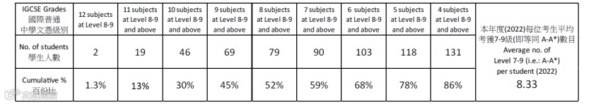 2022年共有152名中四学生参加了IGCSE考试,其中12个科目成绩均在8-9级及以上的共有2名,11个科目成绩在8-9级及以上共有19名,10个科目在8-9级及以上的有46名!