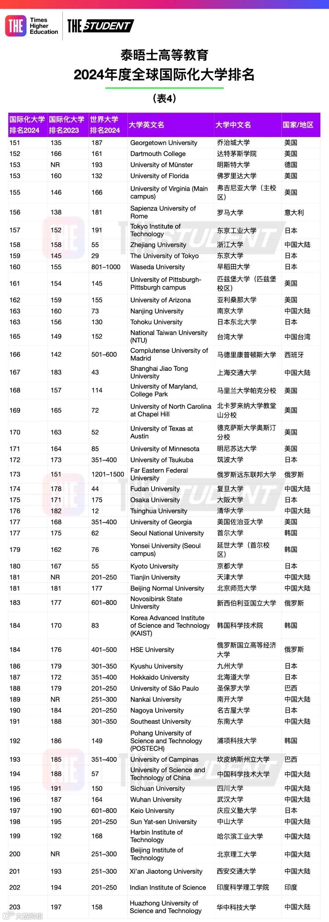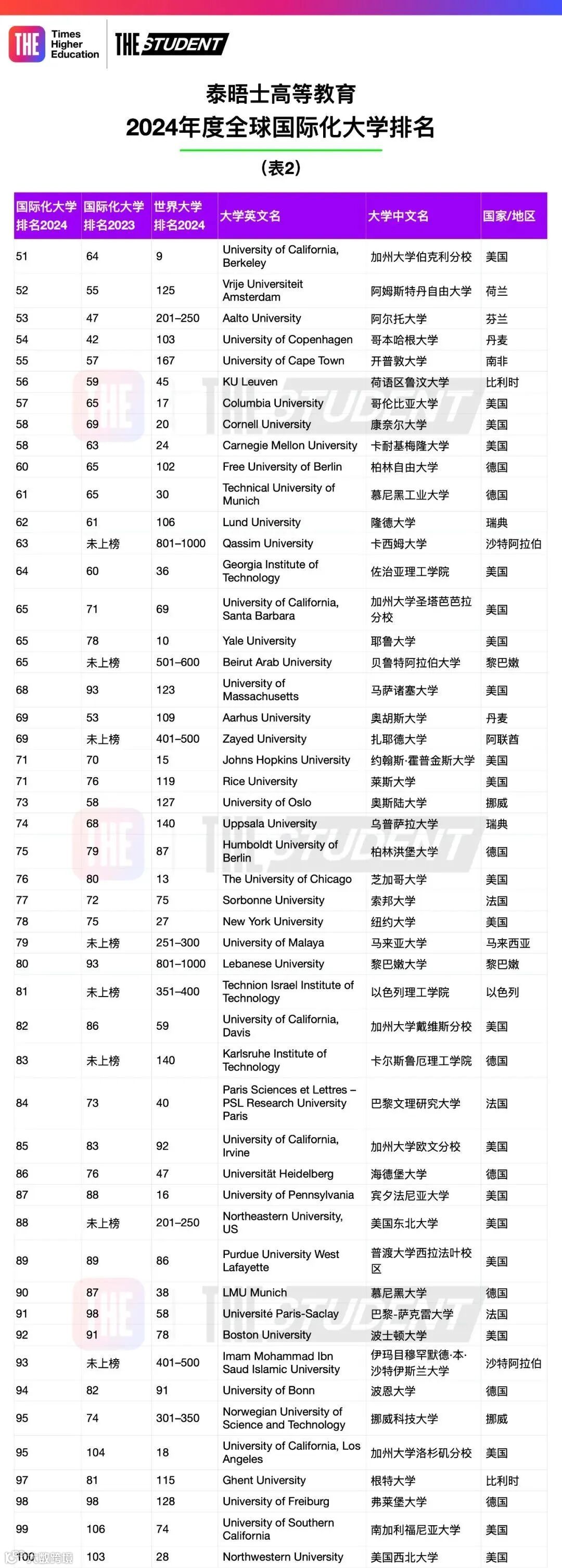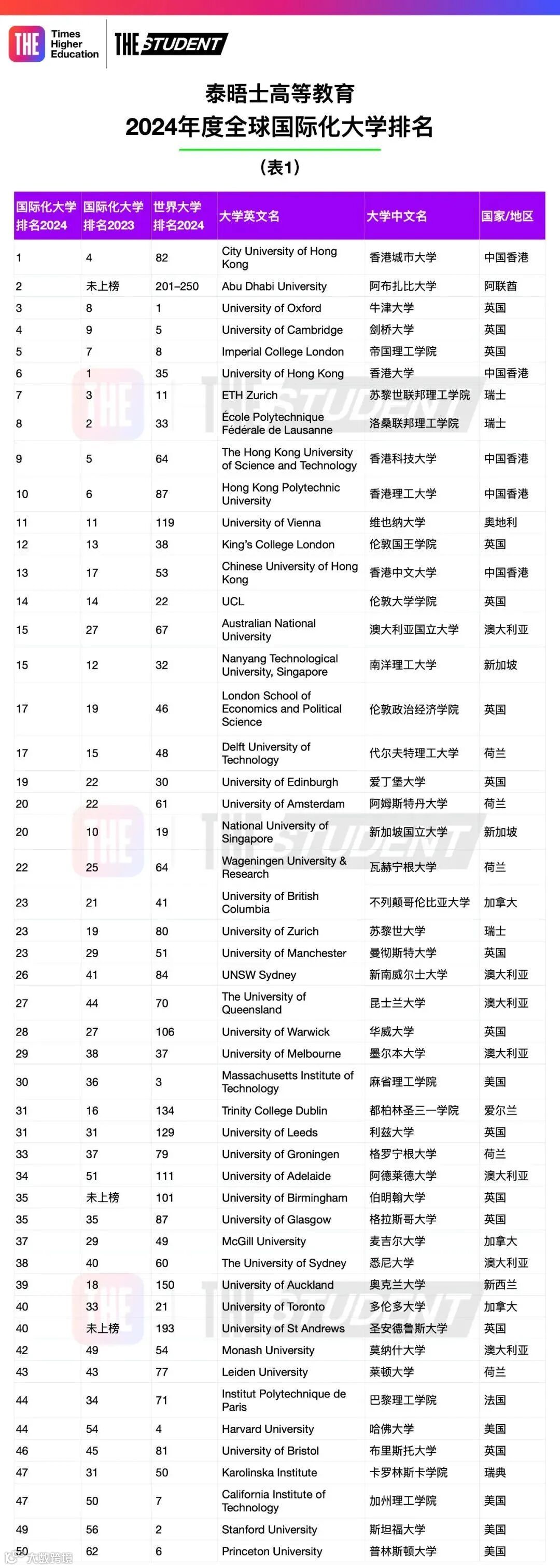 该榜单使用泰晤士高等教育2024年度世界大学系列排名数据中,全球各大学在国际学生、国际职员、国际合著和国际声誉指标上的得分编制而成。