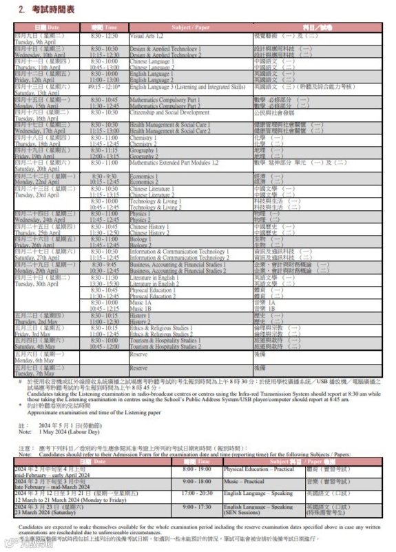 《考生手册》除了一般的考试安排与规则,还有各项考试相关的重要信息,包括:2024年DSE考试时间表、考试相关规则与程序、各科目的应考须知、准用计算机型号等实用资讯。