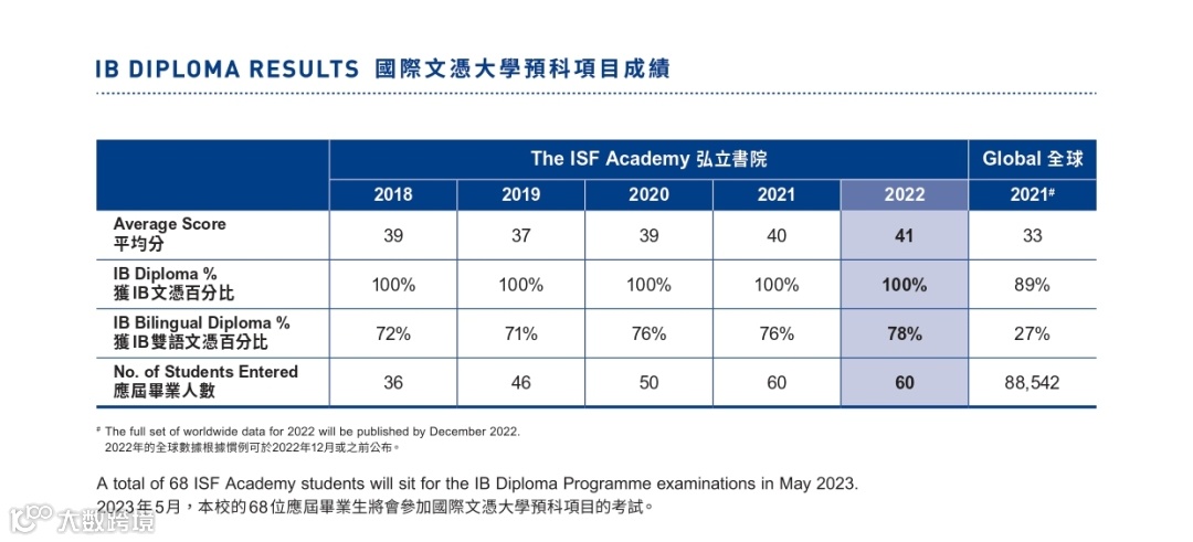 2022年,弘立有60名IB毕业生,其中有5名为IB满分状元,16名为44分或43分的榜眼或探花。而且IB40分以上的学生达到了73.3%。