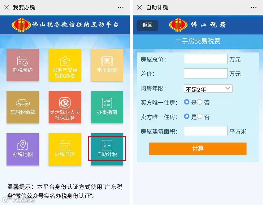 关注【佛山税务】微信公众号,在下方菜单栏点击【我要办税】,再点击【自助计税】,