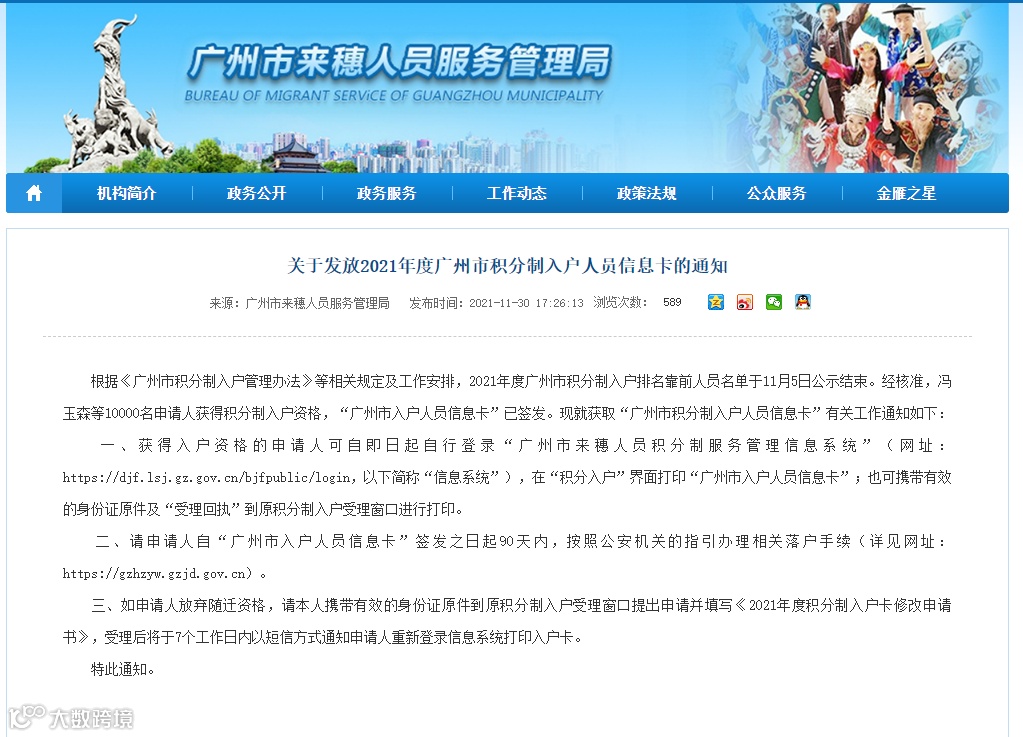 一、获得入户资格的申请人可自即日起自行登录“广州市来穗人员积分制服务管理信息系统”(网址:https://djf.lsj.gz.gov.cn/bjfpublic/login,以下简称“信息系统”),在“积分入户”界面打印“广州市入户人员信息卡”;也可携带有效的身份证原件及“受理回执”到原积分制入户受理窗口进行打印。