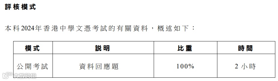 通识科以往分为两卷“资料回应题”+“延伸回应题”;而公社科则只设“资料回应题”一卷,考试为2小时,题目类型包括多项选择题(MC)、短题目及短文章式问题等。