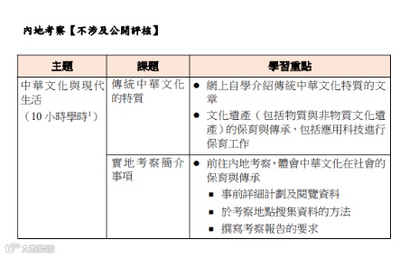 教育局将会提供与课程相关的内地考察团,让学校报名参加。同学则需在考察期间收集资料,并在活动后撰写或设计专题研习报告。