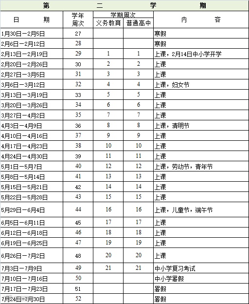 全学年52周。义务教育学校在校时间41周。其中教学时间(周一至周五)39周,含上课时间35周,复习考试2周,学校机动时间2周(由区教育行政部门或学校视具体情况自行安排学校传统活动、文化科技艺术节、运动会、社会实践等);普通高中在校时间42周,其中含教学时间40周以及社会实践和劳动技术2周。