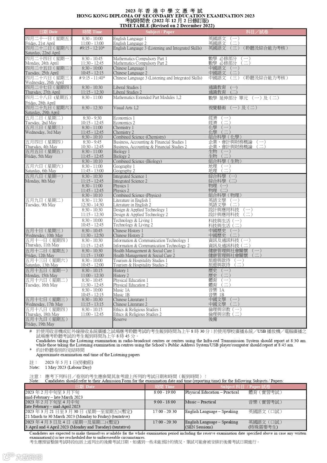 2023年香港中学文凭考试(文凭试)考试时间表详情如下: