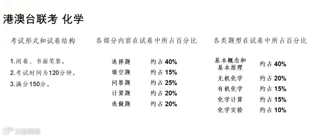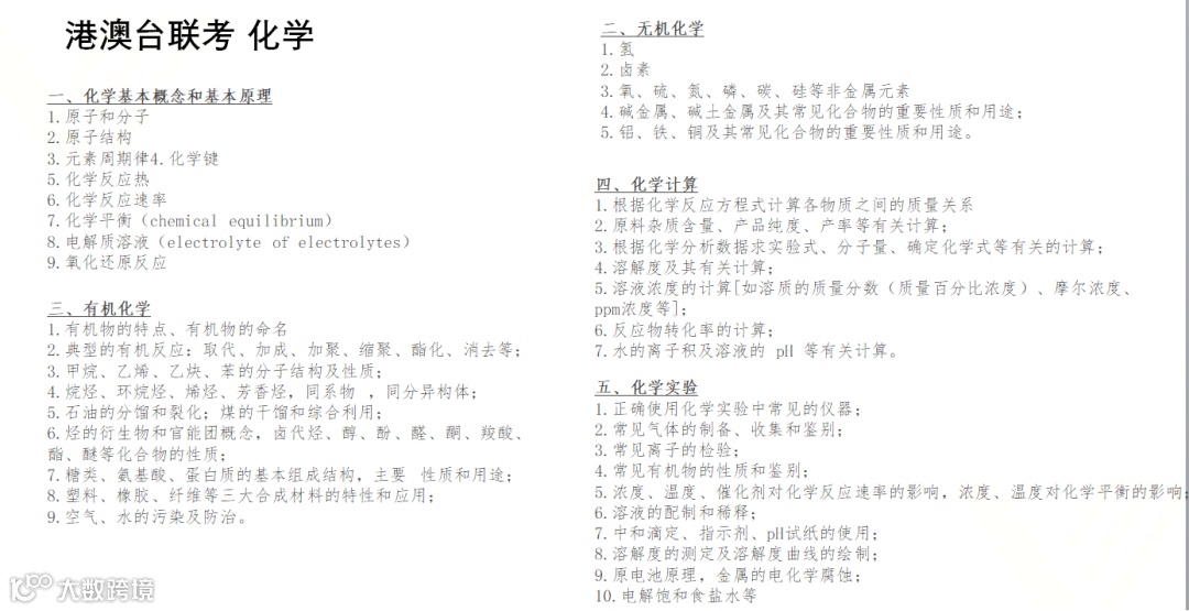 从港澳台联考的化学考纲中我们可以看出来比DSE化学更加细致、更加难,大体分为五个单元:化学基本概念和基本原理、无机化学、有机化学、化学计算、化学实验。化学计算是高考没有涉及的部分,而且考的比较难,比高考的压轴题还要难,也是很多高考生的短板。