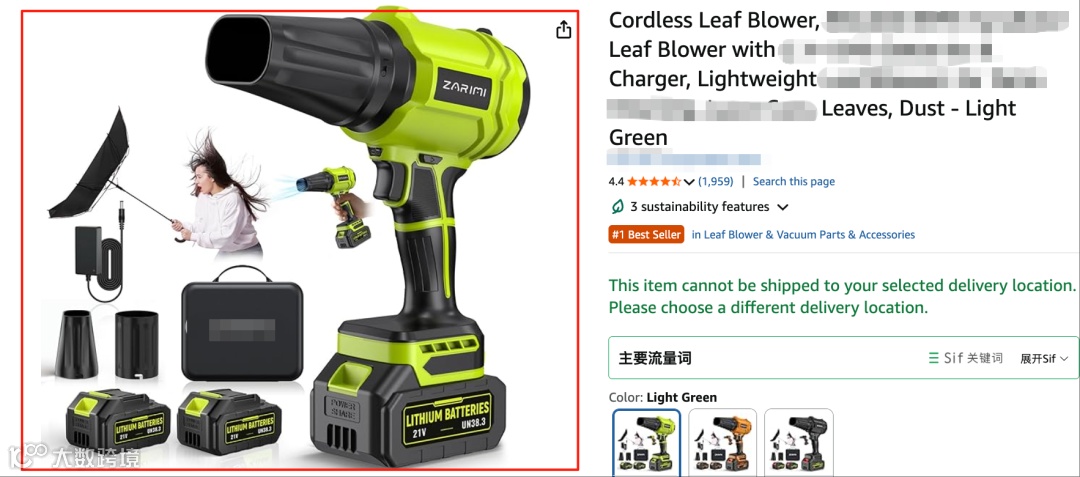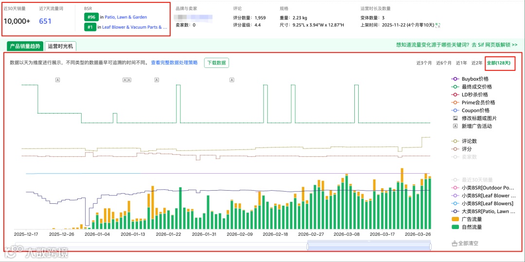 最近关注到一款电动吹叶机:上架128天,最近30天出单超过10000单,日均约334单,在小类Leaf Blower & Vacuum Parts & Accessories冲到BSR第1名,大类Patio,Lawn&Garden最新排名第96,竞争力很强。下面我将带着你拆解它在主图、定价、广告三个核心动作上的逻辑,希望能帮你理清新品推广的思路。