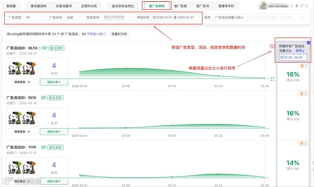 数量,以及各活动的流量占比。注意按流量占比降序排列——占比越大,说明竞品在该广告模式上投入越多,带来的单量也越多。
