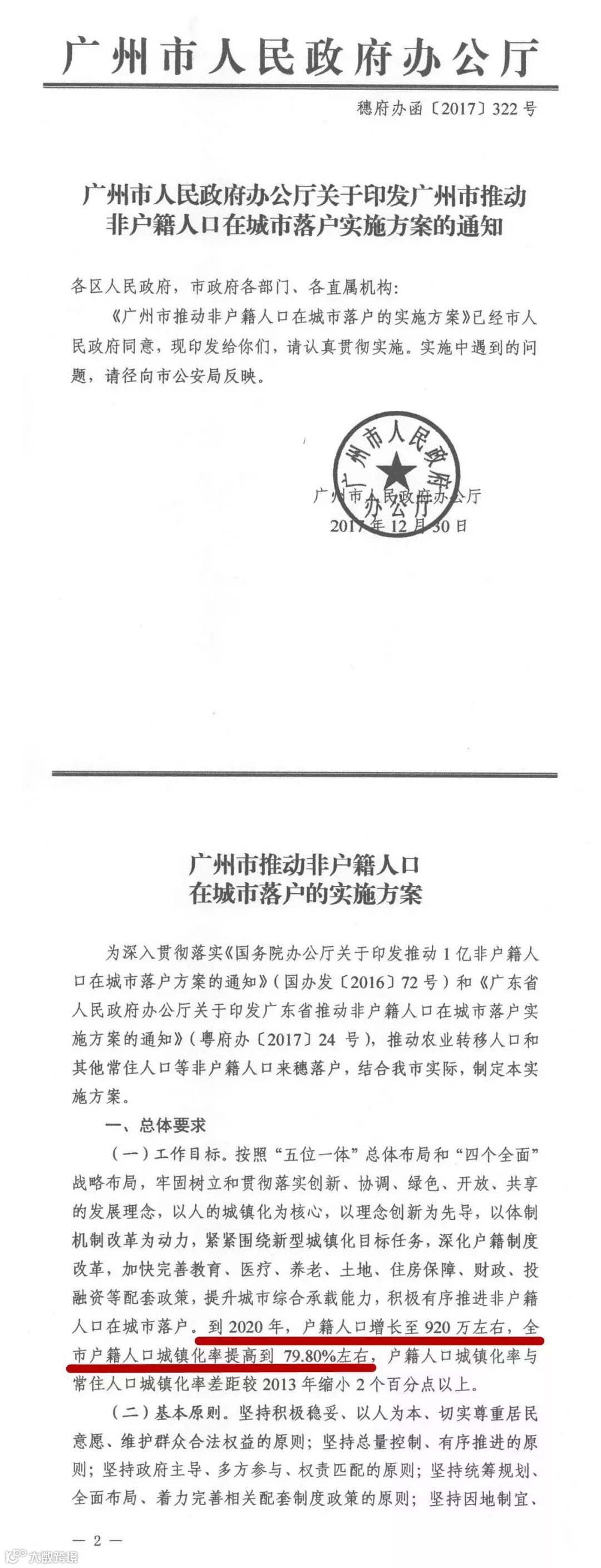 《方案》提出,到2020年广州市户籍人口增长至920万左右(2016年末,户籍人口870.49万人),全市户籍人口城镇化率提高到79.8%左右。