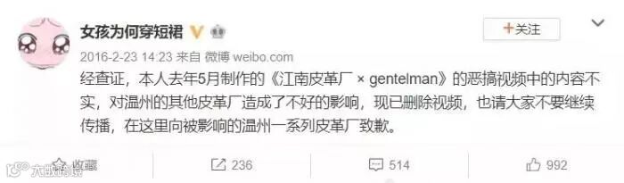 2015年-2016年,改编自上述文案的神曲《江南皮革厂倒闭了》让这个梗二度翻红,却招致众多温州商人的不满,他们向多地主管部门举报这一诋毁行为。后来,歌曲制作人公开道歉,相关商贩也受到行政处罚。