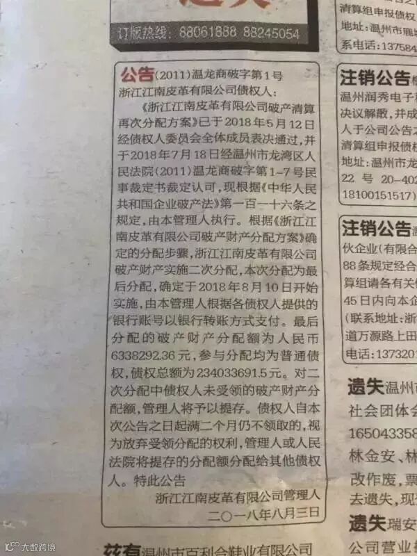 近期,《温州晚报》12版刊登的一则署名为“浙江江南皮革有限公司管理人”的公告称,面向公司债权人,对其破产财产实施二次分配,本次分配为最后分配。最后分配的破产财产分配额为人民币6338292.36元,参与分配均为普通债权,债权总额为234033691.5元。