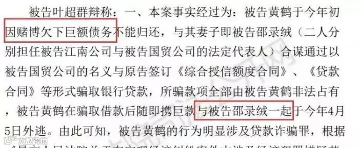 而据每日经济新闻,从浙江法院公开网获得的一份民事判决书显示,在一起涉及深圳发展银行温州分行、温州国信贸易有限公司(法定代表人为邵录绒)和浙江江南皮革有限公司(法定代表人为黄鹤)的金融借款合同纠纷案中,一位名叫叶超群的被告,曾在辩述时称: