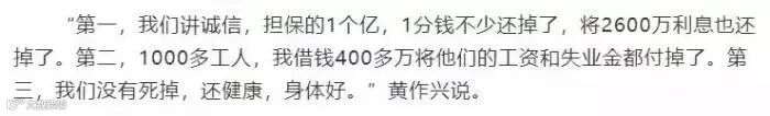 据当时中新网报道,黄作兴替侄子黄鹤还掉了部分债务。当时,黄作兴一共拿出了近1.3亿元,偿还了工厂的担保款和工人工资。