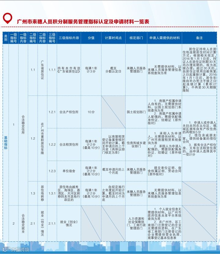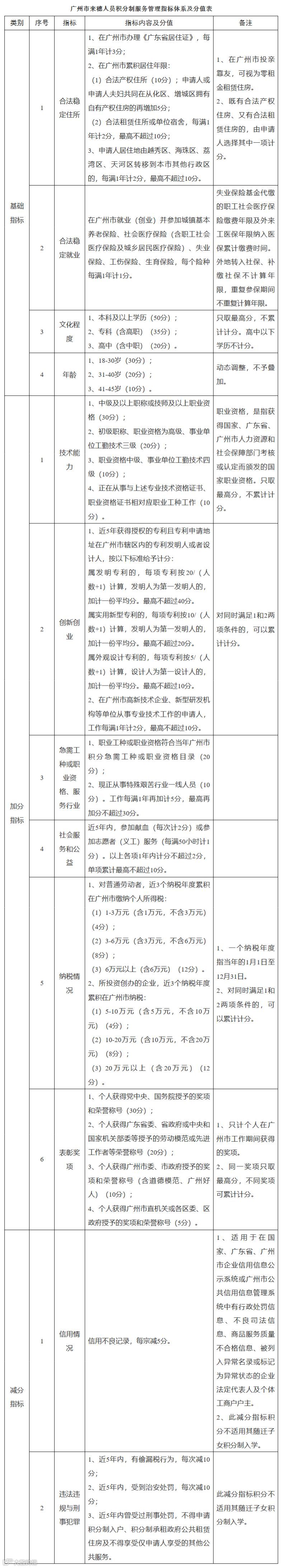 《广州市来穗人员积分制服务管理规定实施细则(试行)》关于“合法稳定住所”中明确,申请人合法产权住所10分;合法租赁住所或单位宿舍,每满1年计2分,最高不超过10分。