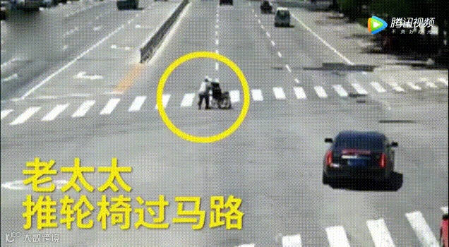 车流中,老奶奶正推着轮椅