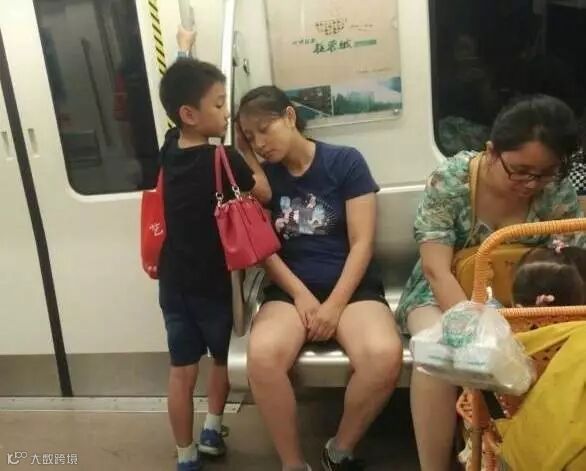 地铁里一位妈妈太累了一直瞌睡
