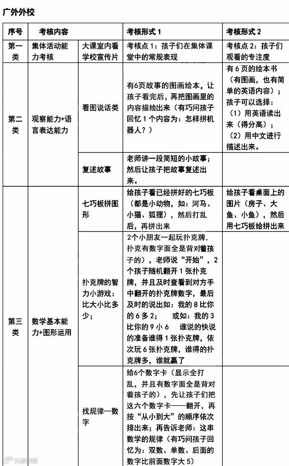 主要考察表达能力,多数家长反映无英语及算数能力的考察