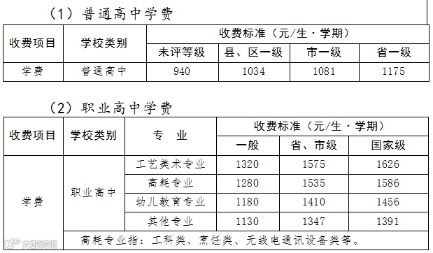 学费标准中,普通高中最高标准的为省一级学校的1175元/生/学期,职业高中最高标准为国家级学校工艺美术专业的1626元/生/学期。