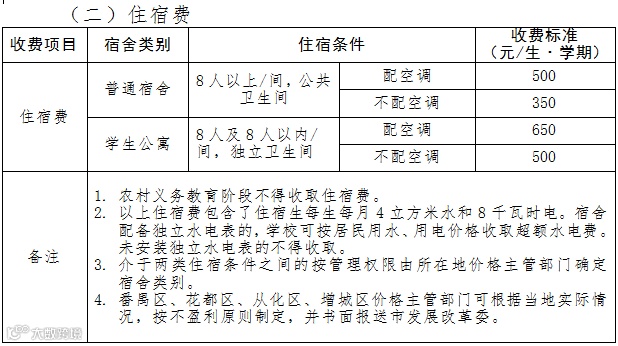 在住宿费方面,《通知》规定了宿舍类别及住宿条件。其中每间8人以上的普通宿舍配空调的为500元/生/学期,不配空调的为350元/生/学期。学生公寓收费标准总体比普通宿舍高出150元。
