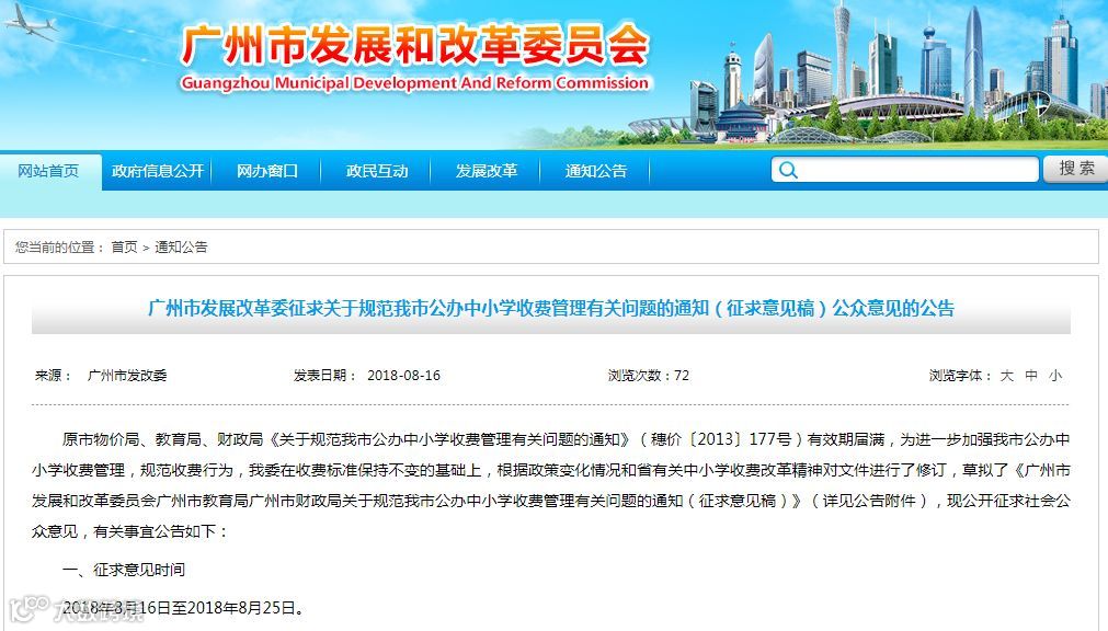 《关于规范我市公办中小学收费管理有关问题的通知(征求意见稿)》意见征求时间为2018年8月16日—25日。