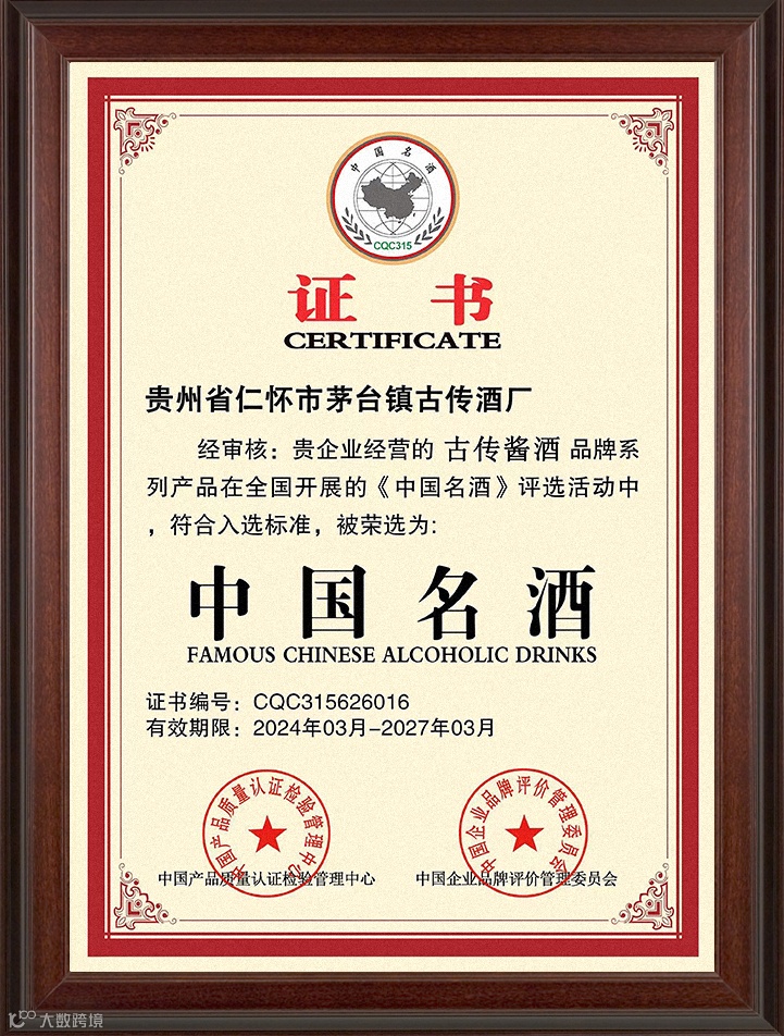 2024年3月,经审核:古传酱酒品牌系列产品在全国开展的《中国名酒》评选活动中,符合入选标准,荣选为“中国名酒”。