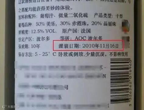 根据中国《预包装饮料酒标签通则》(GB10344-2005)、《发酵酒及其配制酒》(GB2758-2012)和《预包装食品标签通则》(GB7718-2011)规定,进口葡萄酒中文背标必须包含葡萄酒的灌装日期。而国外的酒庄有些会在正标上标示出灌装日期,有些酒庄则不会标示。