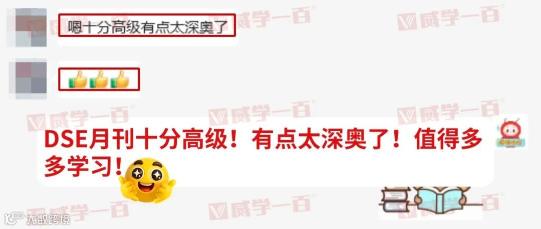在DSE备考领域,威学一百始终将教学研发置于核心地位,《DSE月刊》一经推出,便收获了诸多好评:“《DSE月刊》能积累备考素材,了解教育政策和社会热点,对DSE等考试的通识、面试很有帮助!”“《DSE月刊》能拓宽DSE英语口语和写作思路”“《DSE月刊》能更全面了解香港,学习更多local的表达”……学员们的一致好评展现出《DSE月刊》的实用性!这也激励着我们继续用心准备每一期刊物,及时为学员提供有价值的资讯。