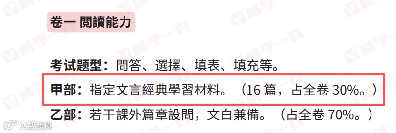 根据DSE中国语文考纲,卷一阅读能力中,指定篇章(甲部)与课外阅读(乙部)占比约为3:7,其中甲部占全卷的30%,看似占比不高,却是“稳分关键”。