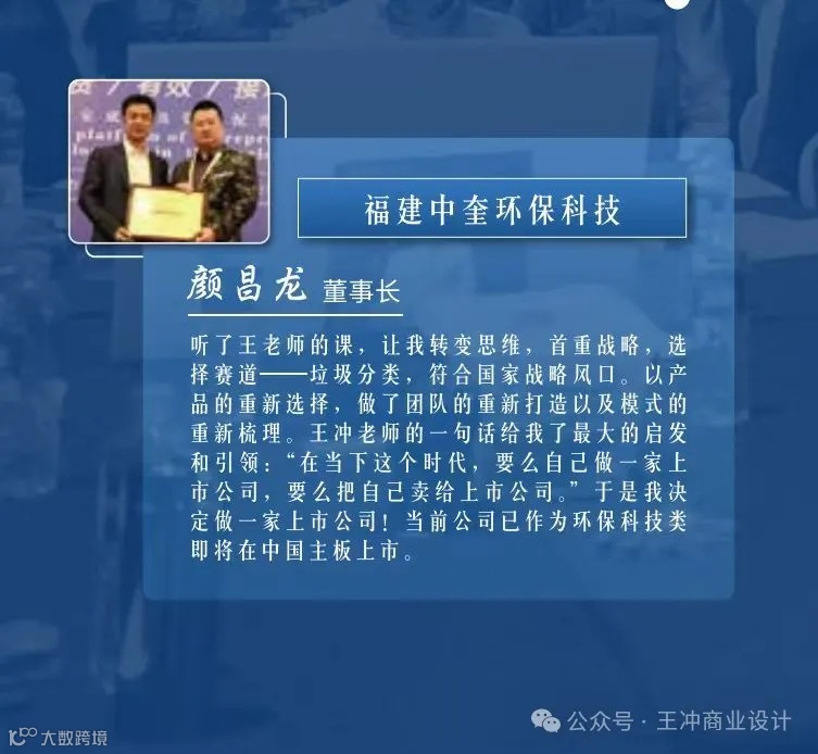 听了王老师的课,让我转变思维,首重战略,选择赛道—垃圾分类,符合国家战略风口。以产品的重新选择,做了团队的重新打造以及模式的重新梳理。王冲老师的一句话给我了最大的启发和引领:“在当下这个时代,要么自己做一家上市公司,要么把自己卖给上市公司。”于是我决定做一家上市公司!当前公司已作为环保科技类即将在中国主板上市。