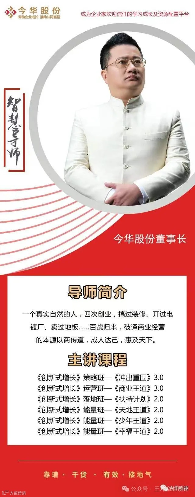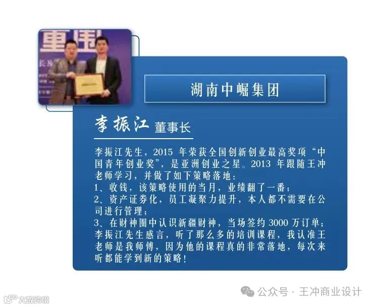 中崛集团董事长李振江,跟随王冲老师学习多年。李总学会了收钱、收心策略,每月一期招商会,从招聘到招商,一招收人收钱收心,营业额得到了上涨,业绩翻了几倍。公转、自转策略为员工提供足够的动力,树立了员工的梦想,全员上下一心,共同维护公司的利益。经过王冲老师的辅导中崛还组建了自己的新媒体抖音团队,抢占了互联网先机,让企业在如今激烈的市场竞争中立于不败之地!
