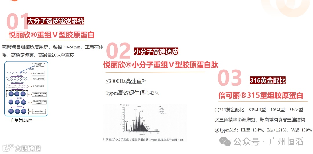 315胶原占皮肤胶原95%含量,起到支撑皮肤轮廓,撑起肌肤弹性和细胞代谢的作用,通过直补315胶原,可作为315合成原料,其活性位点调节细胞活力,加速真皮胶原合成,起到抗皱、紧致功效。
