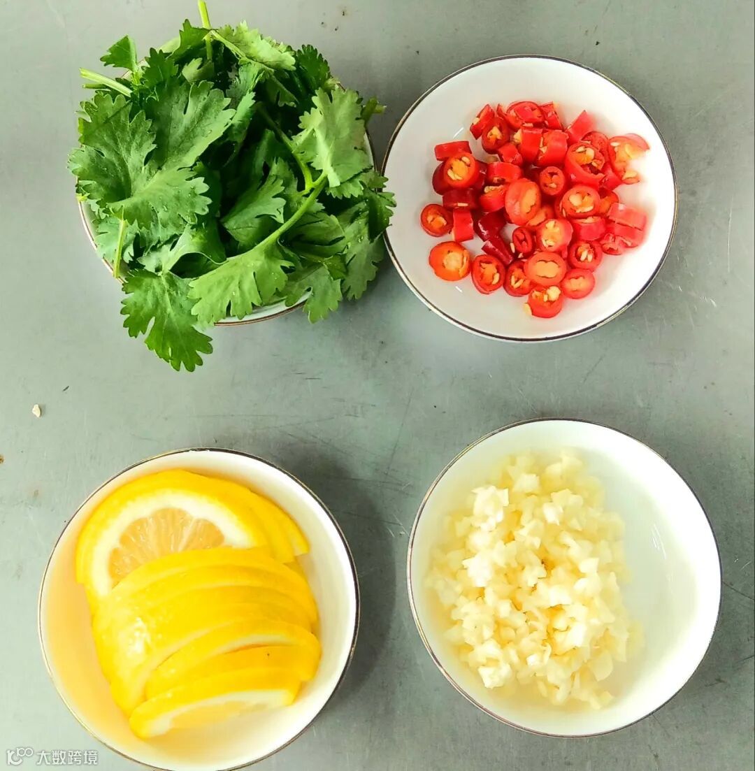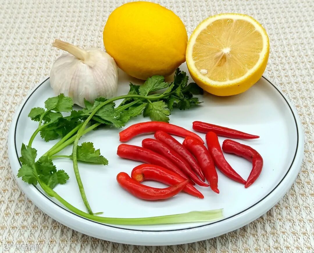 辅料:柠檬、朝天椒/小米辣、蒜头、香菜。