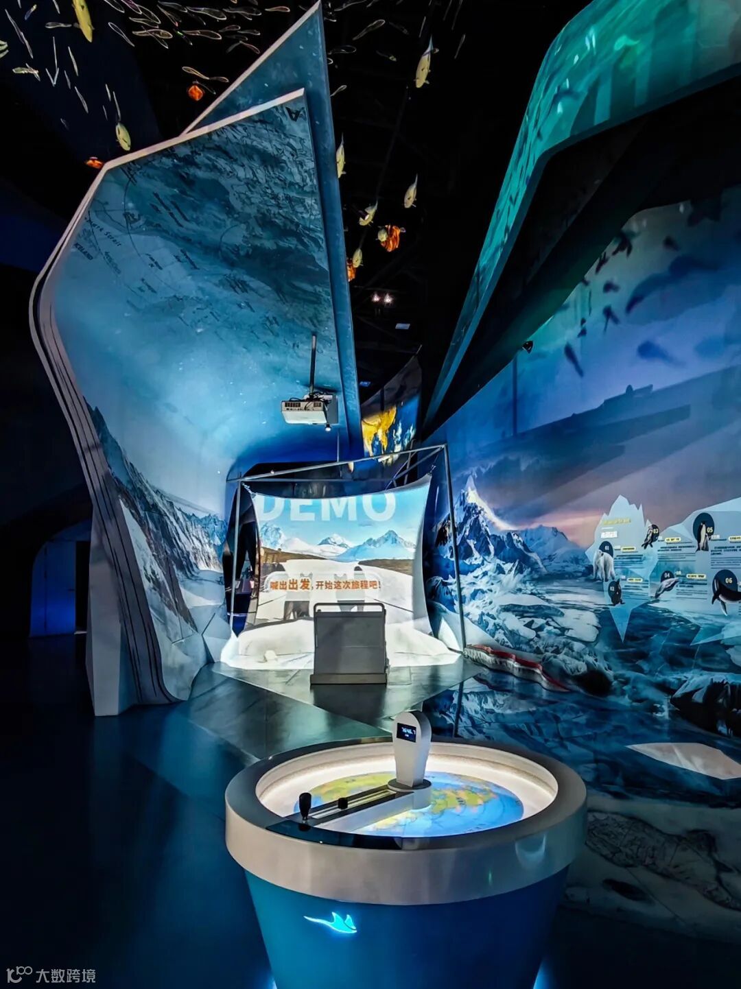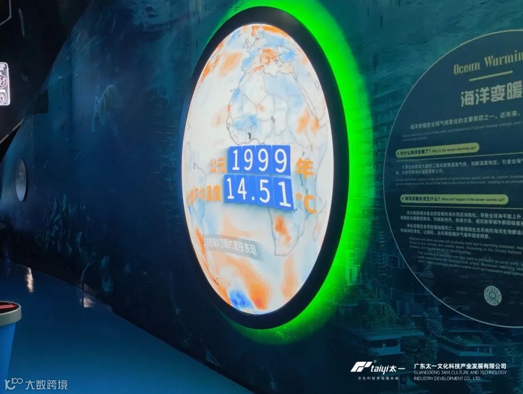 “海洋变暖” 展项以互动装置唤醒环保意识。“温度计” 操作台配备可调节滑杆,模拟全球升温趋势,一旁球面投影模型实时数据联动。通过实时数据可视化与互动装置,让观众深刻感知气候变暖对自然与人类生活的严峻影响,激发守护海洋生态的责任感。