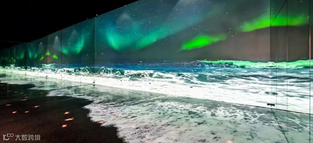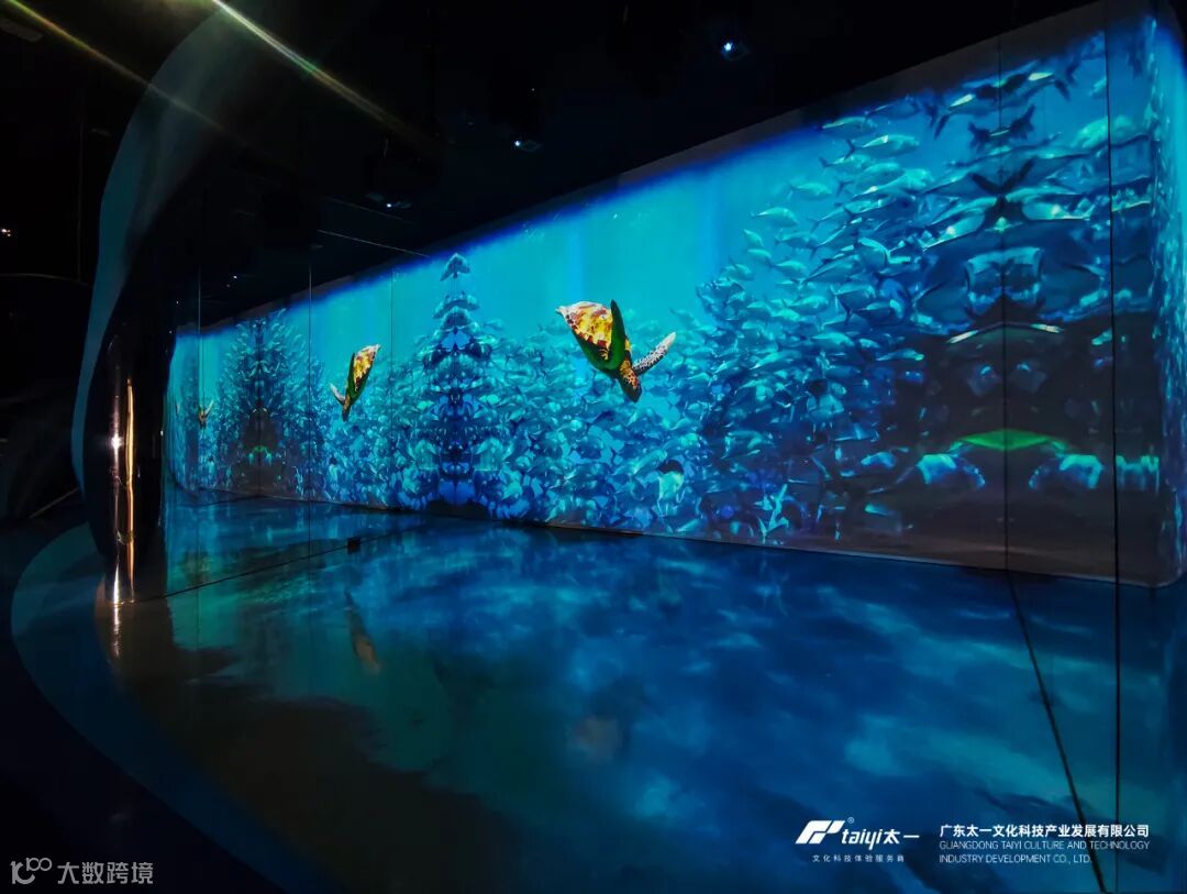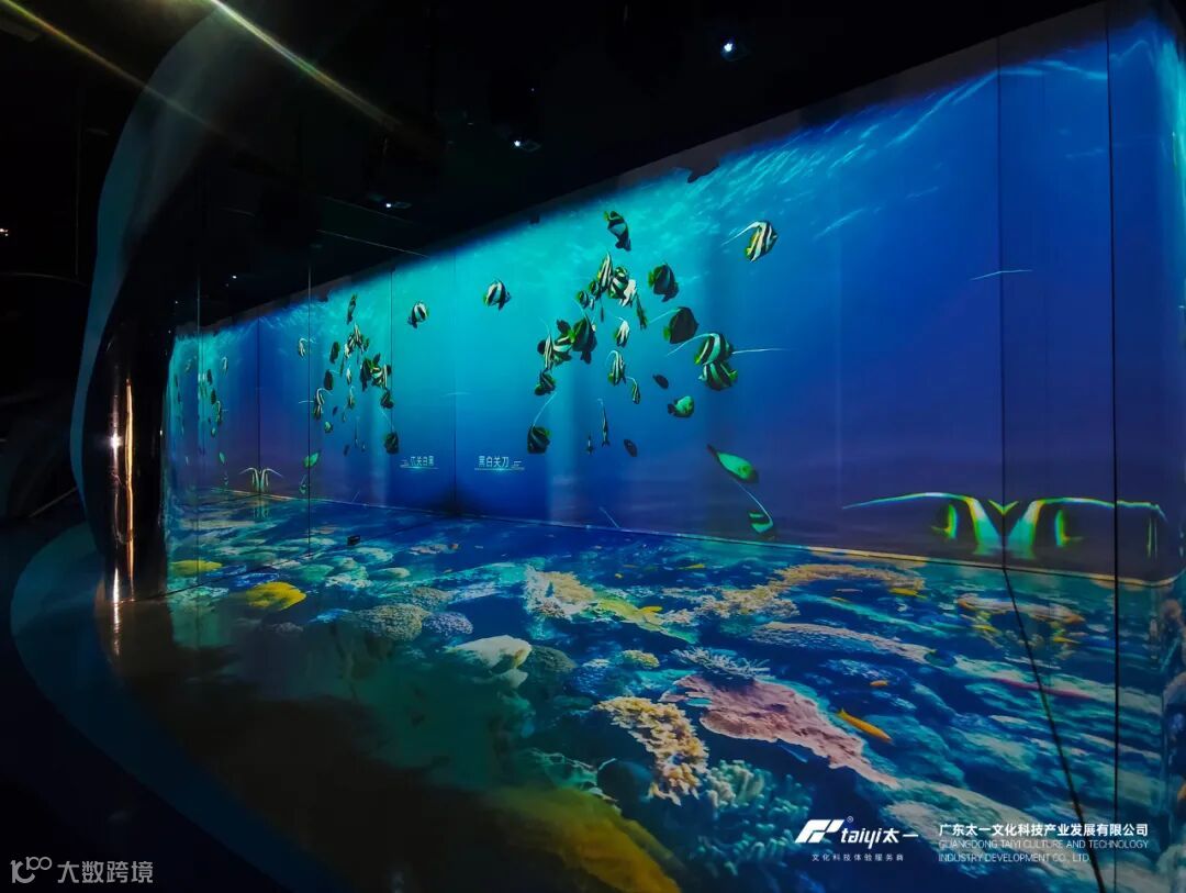 作为探秘海洋展馆的核心展项之一,“海洋之美”呈现出海洋立体化多视角的生动图景,通过高清银镜结合墙面与地面互动投影技术,构建了一个全数字化的沉浸式海洋空间,循环播放“与共”“流光”“异彩”和“磅礴”“生息”5个篇章来呈现不同角度下的海洋之美。踏入地面感应互动区域,会触发地面投影水波纹、海洋生物等氛围动画。利用沉浸式影像与声音,引导观众欣赏海洋的壮丽景观与生态多样性,激发对海洋的情感共鸣。