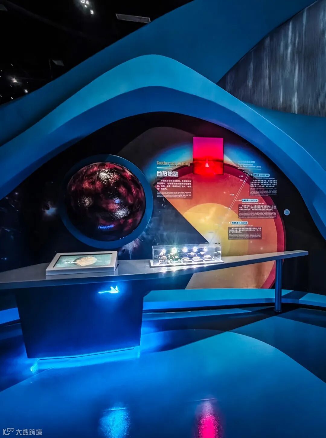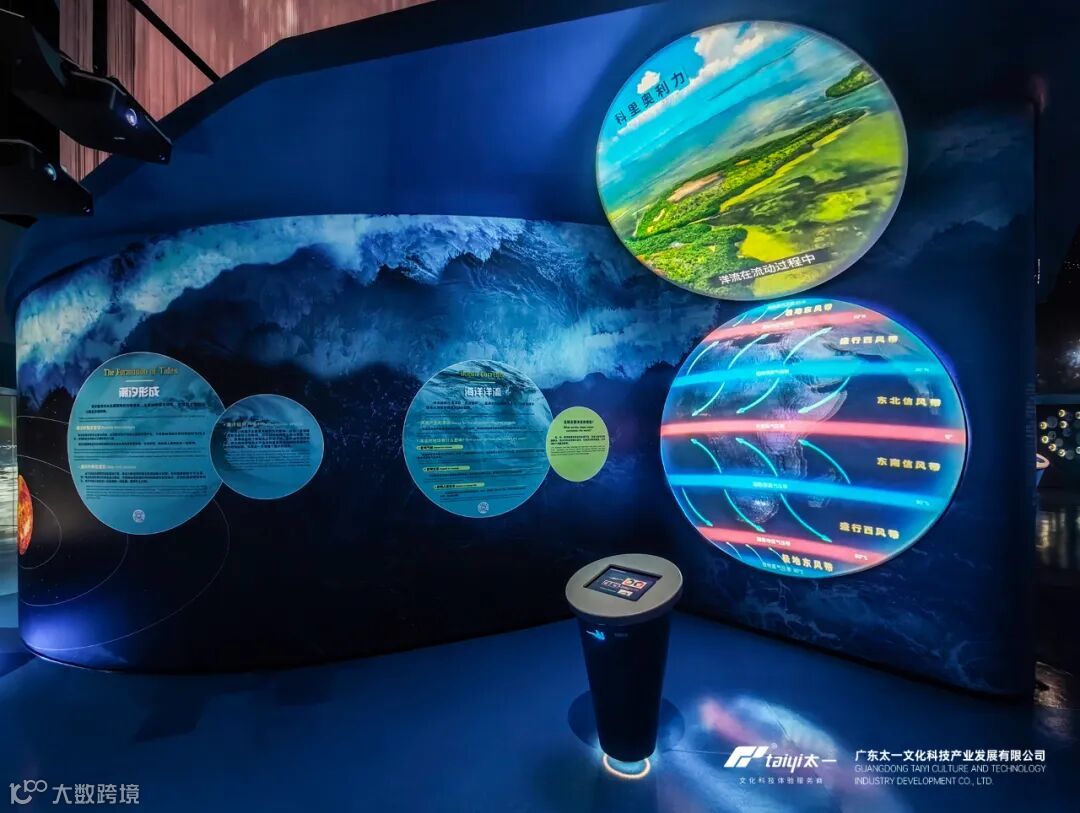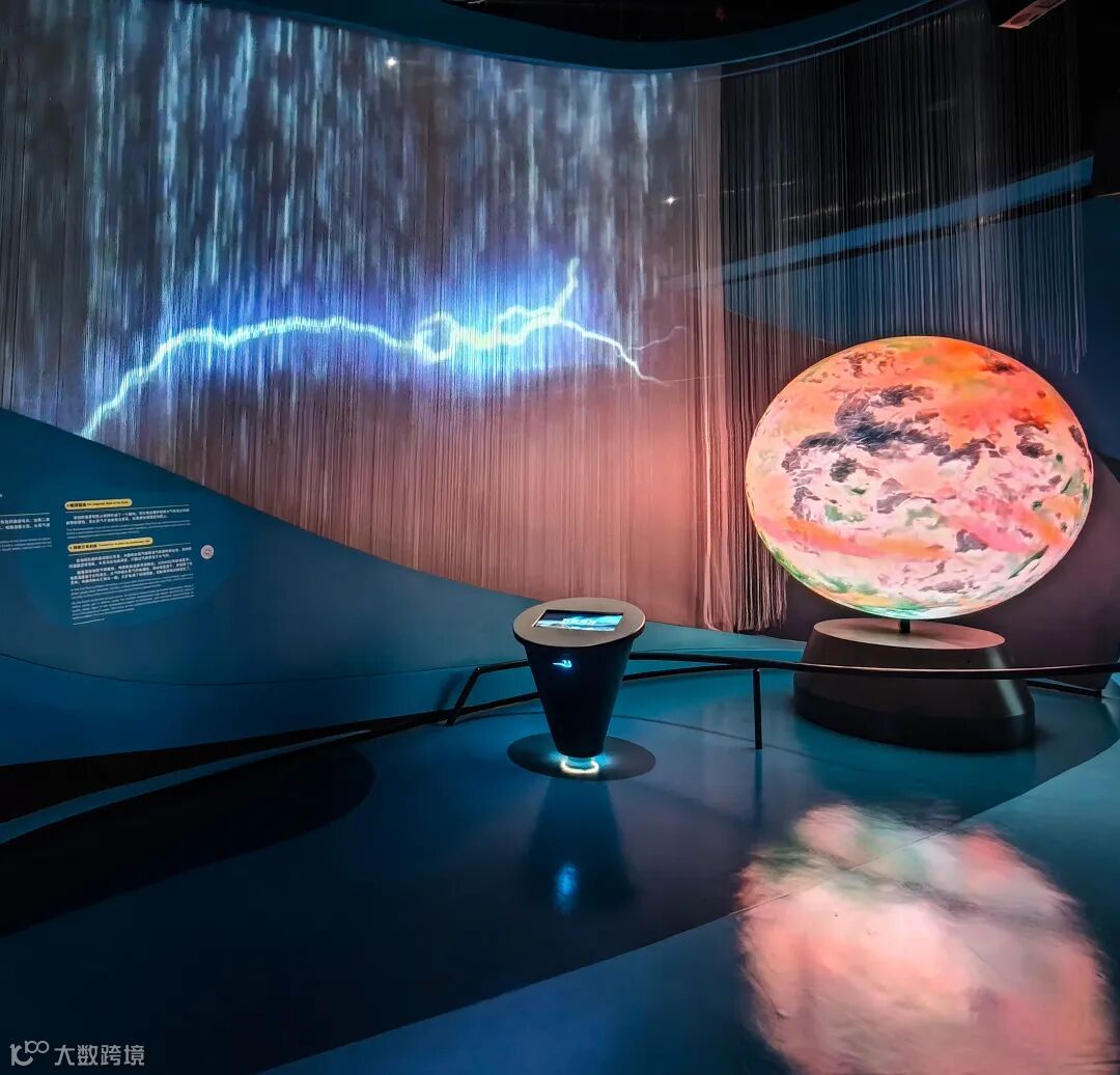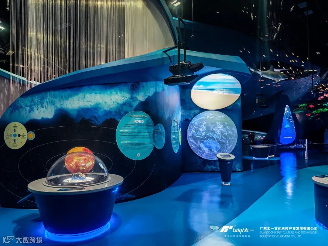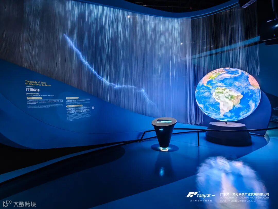“万雨成洋”:展项由“雨帘”、投影、球幕、触摸屏等构成,沉浸式演绎全球水循环与海洋形成过程。“雨帘” 装置以震撼的视觉效果,动态呈现岩浆地壳、浓云密布、万年暴雨、众水成洋四个阶段的天气奇观;球幕则以 360 度全景视角,逼真模拟地球从 “火球” 到 “水球” 的演化过程。观众还能通过触摸屏,自主探索更多科普知识影像。在这里,观众不仅能深入认识海洋起源,更能激发对海洋科学的探索热情,尤其适合青少年感受科学魅力。