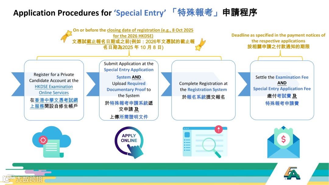 需要特殊申请的考生必须先在考评局官网特殊报考申请系统(8月18号后开启)递交申请,然后再进行考试报名。