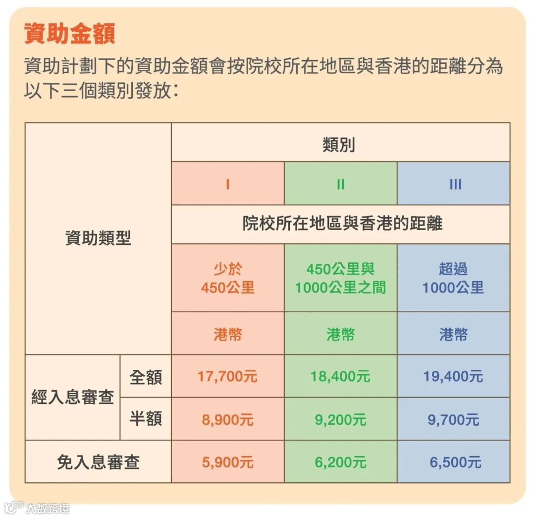 申请人在同一学年内,只可接受“经入息审查资助”或“免入息审查资助”二者其一。金额会按院校所在地区与香港的距离,分为三个类别发放。