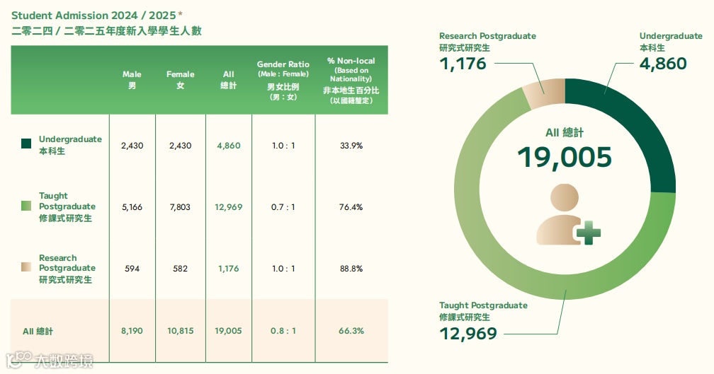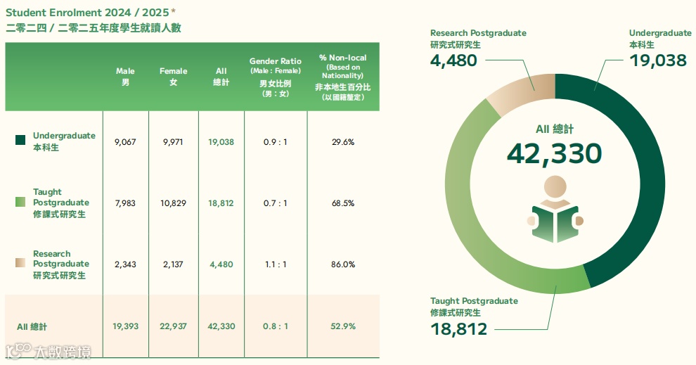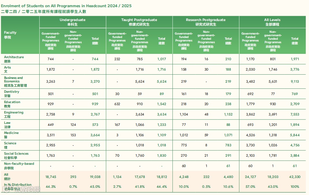 2024/25学年,香港大学在校学生总数比上一学年(39,166人)新增了3,164人,为42,330人,其中本科生人数从18,491人增至19,038人,其余均为研究生阶段学生,规模实现稳步增长,反映出港大优质办学实力对全球学子的持续吸引力。