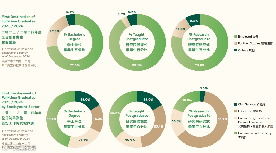 港大的调查结果揭示了本科毕业生在职业选择上的偏好。2023/24学年港大本科毕业生中,72.6%选择直接就业,22.3%选择继续攻读研究生课程,剩下的5.1%则选择了其他;修课式研究生中,90.4%选择直接就业,3.7%继续进修。