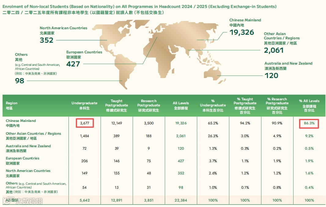 而在所有入学新生中,非本地生总占比66.3%。其中,本科新生非本地生百分比为33.9%,高于上一年(2023/24为25.5%)。此外,修课式研究生非本地生更是占到了76.4%。