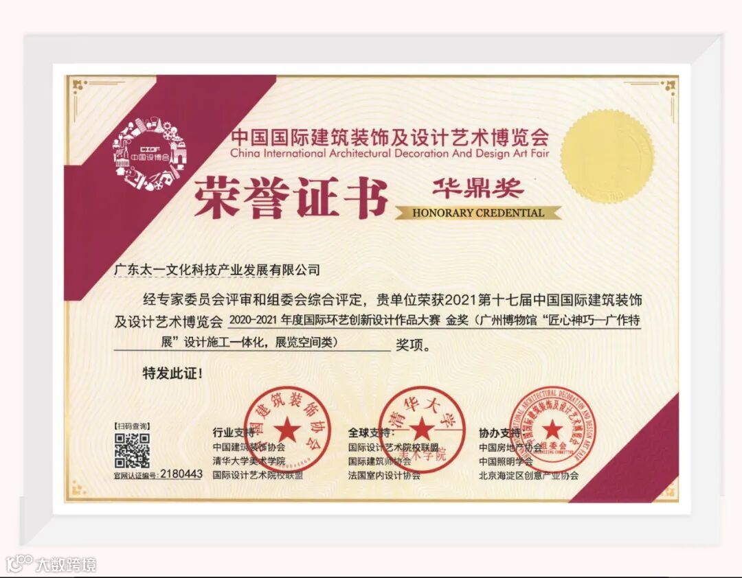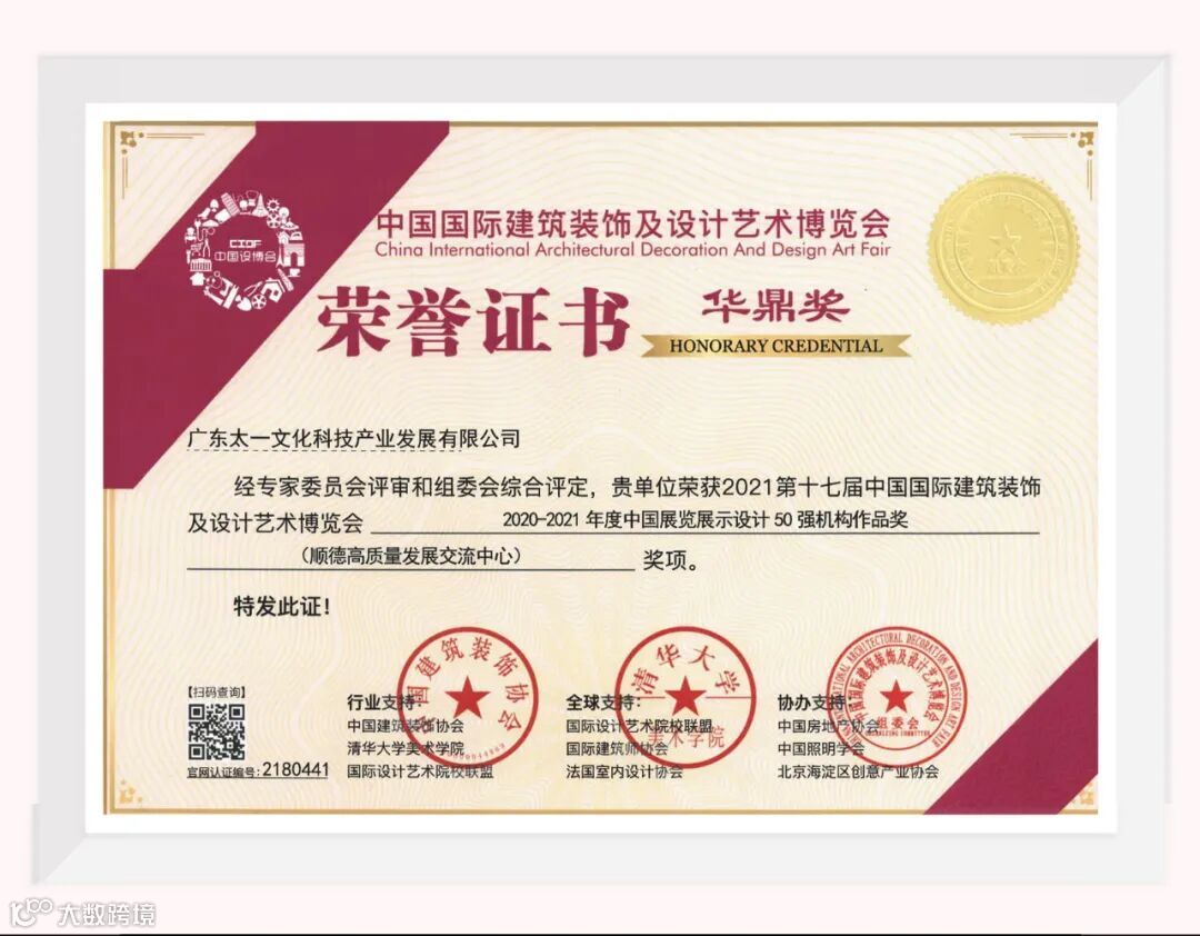近日,由中国国际建筑装饰协会主办,清华大学美术学院、中国建筑装饰协会环境艺术分会等权威组织联合主办的第十七届中国国际建筑装饰及艺术设计博览会“华鼎奖”评审结果公布,广东太一荣获“华鼎奖•金奖”等多个奖项。