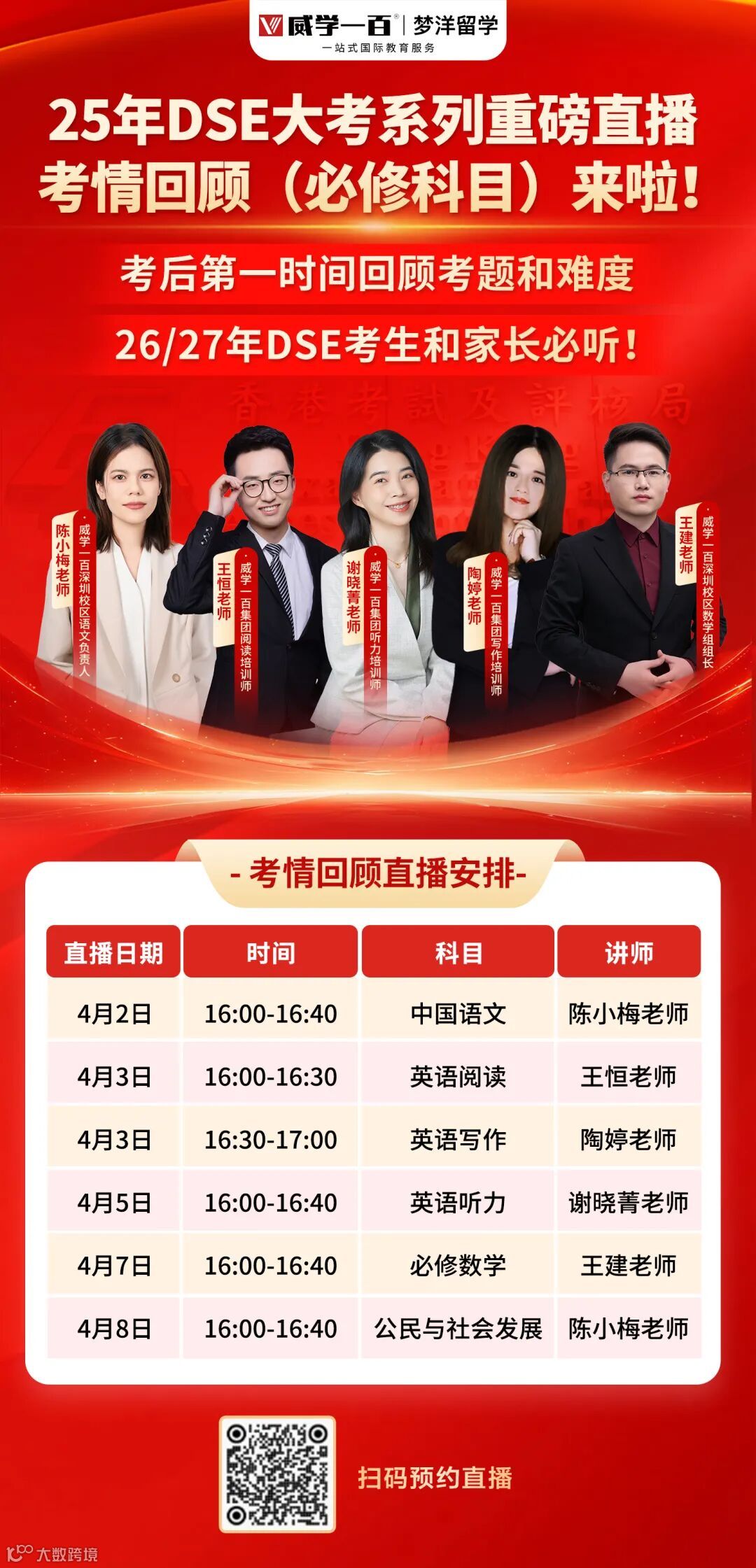 25年DSE大考系列重磅直播——考前之夜(必修科目)线上直播于4.2-4.7晚上19:00持续精彩开播,老师们将带领同学们在考前实现快速梳理必考点、重难点和易错点,全面提升备考质量和效率!此外,25年DSE大考系列重磅直播——考前回顾(必修科目)线上直播于4.2-4.8下午16:00持续精彩开播,由我们亲赴考场的老师带来第一手的考情回顾,欢迎大家扫码下方海报预约直播!