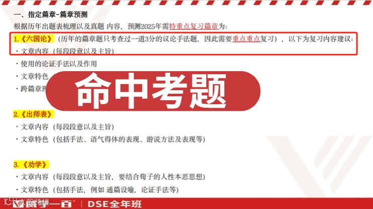 此次DSE大考期间,我们始终与广大考生并肩作战,为此精心策划了「25年DSE大考系列重磅直播——考前之夜(必修科目)」线上讲座,助力同学们实现考前高效备战!在开考前夕,陈小梅老师倾情分享了中国语文的必考点、重难点和易错点,并精准预测了本次考试古文篇会考《六国论》,考后同学们发现就真的考了,直呼“真是太厉害啦”、“简直预测神准哇!”