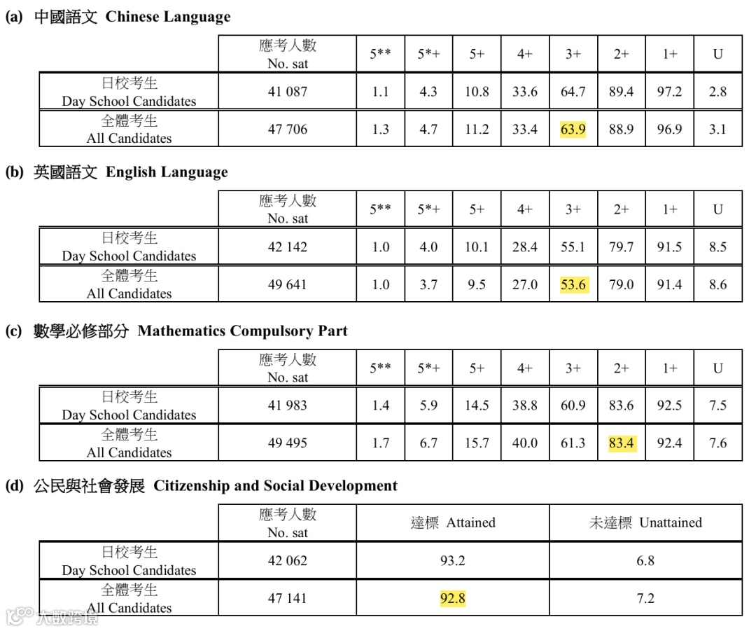 从2025年DSE全体考生核心科目成绩数据来看:中国语文达标率为63.9%,英国语文为53.6%,数学必修为83.4%,公民科为92.8%。显然,英语是所有核心科目中达标率最低的科目,也被内地学生戏称为“死亡之卷”。