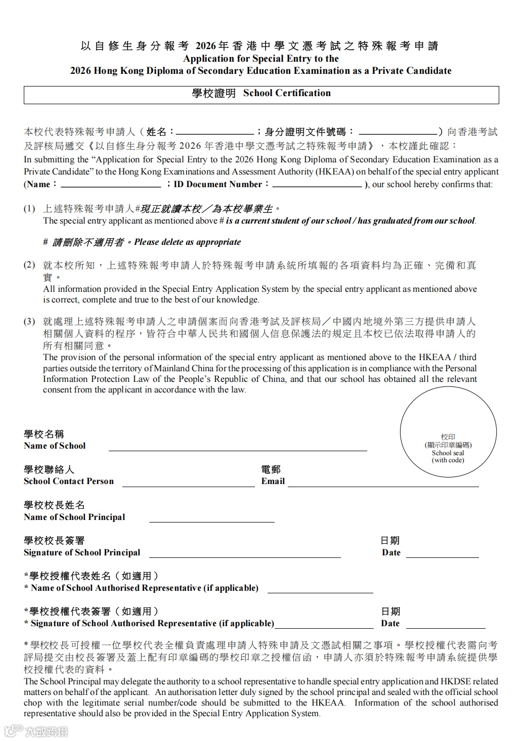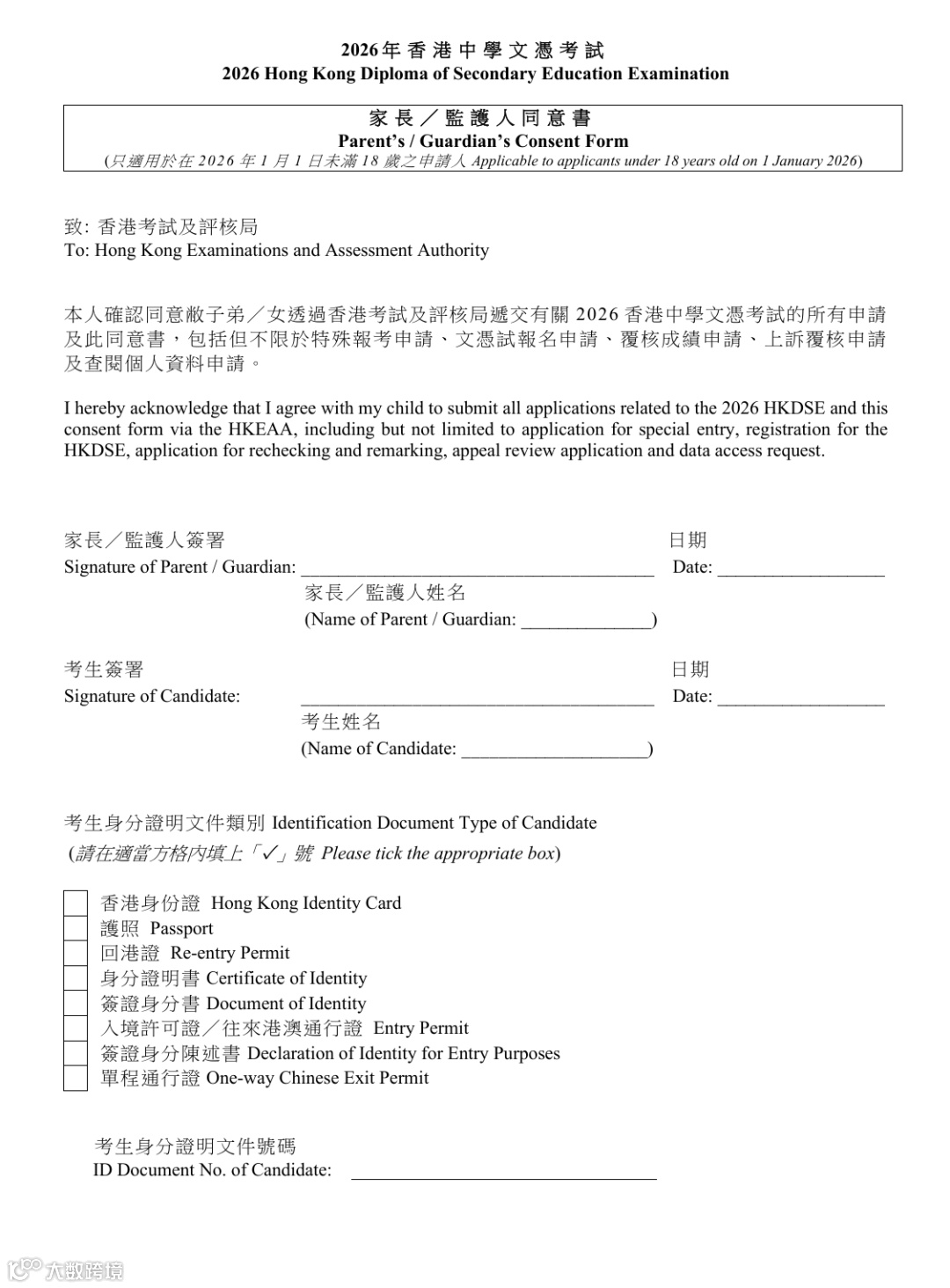 家长/监护人同意书(适用于以考试年份之1月1日计算未满18岁之申请人);