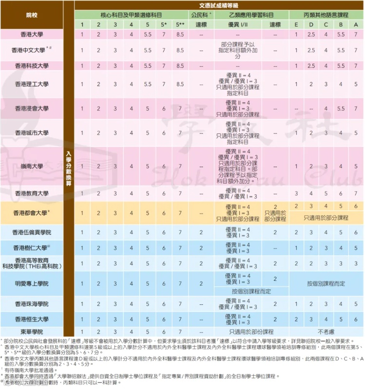 近年不少大学也更改了计分的方法。在港大、中大、理大及科大的计分表中,第5级不再是5分而是5.5分,5*计作7分,而5**计作8.5分,同学要更留意自己的分数在不同院校的不同计法。丙类科目的分数转换也要留意,有修读相关科目的同学要注意!
