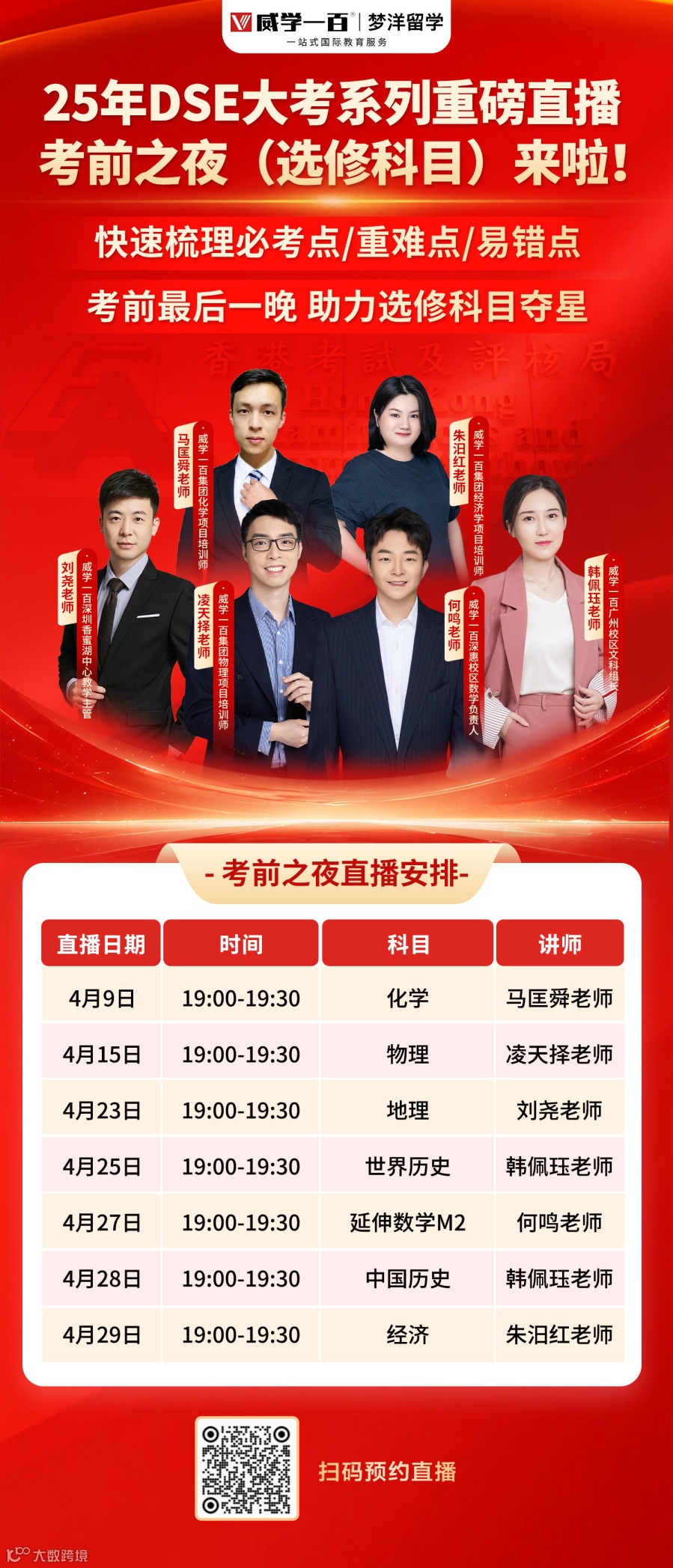 此外,25年DSE大考系列重磅直播——考情回顾(选修科目)线上直播于4.29-4.30持续精彩开播,由我们各科目老师为大家详细讲解各科目的考情回顾,欢迎大家扫码下方海报预约直播!