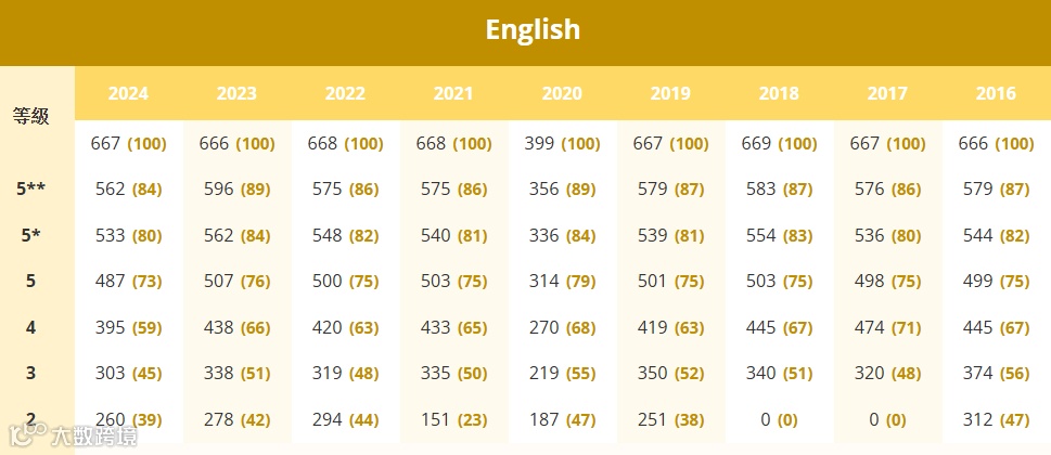 DSE分数一般会按等级直接换算,即「1」= 1分、「2」= 2分、「3」= 3分、「4」= 4分、「5」= 5分、「5*」= 6分、「5**」= 7分。需要注意的是,5**并不代表试卷满分,而是代表在排名中位列前茅。